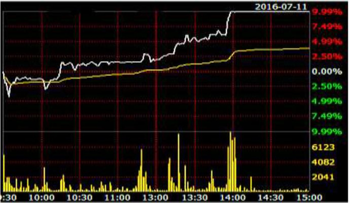 2016年7月5日至7月12日為賬戶組操縱A 股票的拉抬建倉(cāng)期。7月5日至8日,股價(jià)相對(duì)平穩(wěn),賬戶組合計(jì)買入A股票900.59萬(wàn)股。7月11日,賬戶組開(kāi)始制造漲停板走勢(shì):14:03:18至14:06:13拉抬股價(jià)至漲停后,繼續(xù)以漲停價(jià)申報(bào)買單,共申買29筆合計(jì)600.93萬(wàn)股。截至當(dāng)日收盤,賬戶組未成交的漲停價(jià)買入申報(bào)量達(dá)574.86萬(wàn)股,占全市場(chǎng)未成交漲停價(jià)買入申報(bào)量的51.73%。7 月11日股價(jià)走勢(shì)詳見(jiàn)下圖: